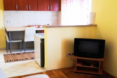 Ova garsonjera od 22m2 je jako lijepo uređena, sa dva ležaja u dnevnoj sobi, koji se razvlače. Tu su i komoda sa TV-om i ormar. Kuhinja je od dnevne sobe odvojena šankom. Kupatilo ima tuš kabinu kao i mašina za pranje i sušenje veša jer stan nema balkon.