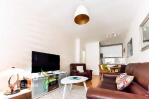 Dnevna soba je prostrana i lijepo osvijetljena, opremljena velikom kožnom garniturom, posjeduje veliki Smart televizor i klima uređaj. Ima izlaz na balkon. U nastavku dnevne sobe je trpezarijski dio koji je opremljen trpezarijskim stolom i stolicama modernog izgleda. Iz trpezarije se nastavlja prelijepa, moderna kuhinja, sa lijepo dizajniranom sudoperom, finim elementima i svim neophodnim aparatima (šporet sa ravnom pločom, frižider, ugradna mikrotalsna).