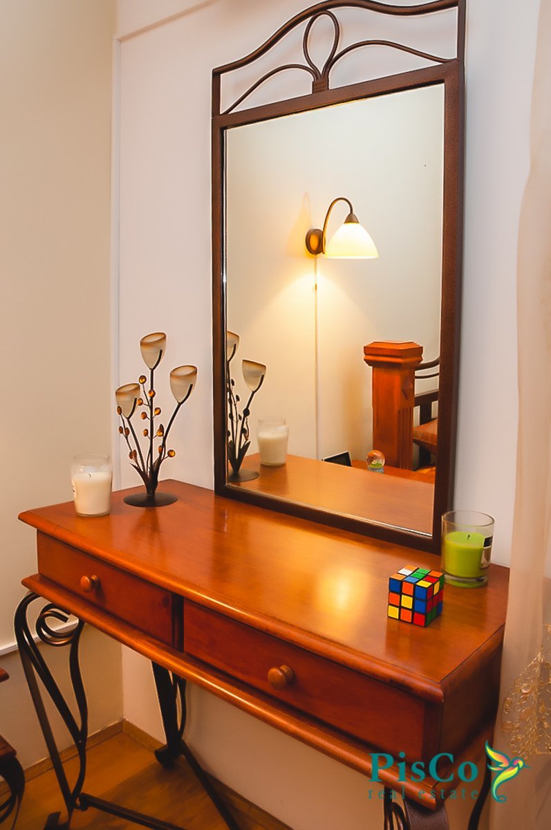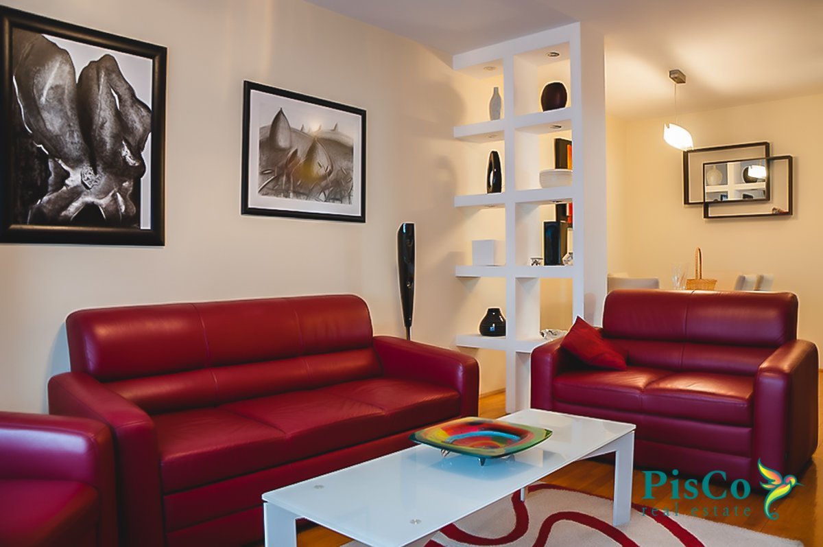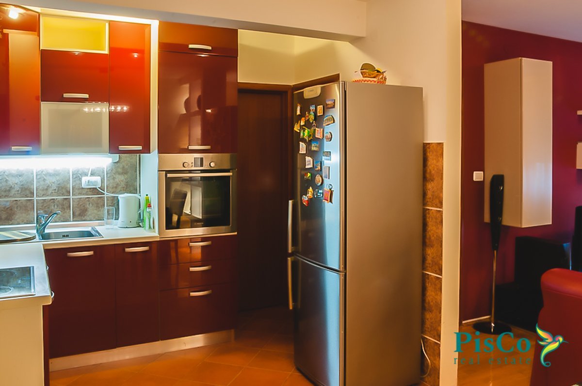 Stan je veoma lijepo opremljen i sa ukusom, sav namještaj je nov, finog dizajna i boja. Dnevni boravak ima veliku garnituru, TV i klima uređaj, i izlazi na balkon. U sklopu je trpezarijski dio sa stolom i stolicama, a u nastavku kuhinja, moderna, rađena po mjeri i opremljena svim neophodnim aparatima. Jedna spavaća soba ima veliki bračni krevet, kao i ugradni orman. Druga soba je opremljena singl krevetom, radnim stolom i ormanom.