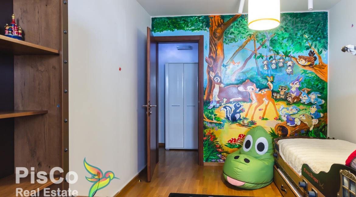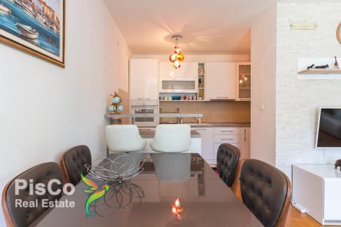 Stan je veoma prostran, o čemu dovoljno govori i ova kvadratura za dvosoban stan. Lluksuzno opremljen, vidi se na prvi pogled da je vođeno računa o svakom kutku ovoga stana. Stan je veoma topao i osunčan. U dnevnoj sobi je velika kvalitetna garnitura i TV, u nastavku je kuhinja odvojena šankom. Kuhinja je rađena kvalitetno i opremljena je svim neophodnim kuhinjskim aparatima. U nastavku je spavaći blok gdje je u jednoj sobi veliki bračni krevet, a druga je dječija soba sa kvalitetnim krevetom , radnim stolom i ormanom. Iz spavaće sobe sa bračnim krevetom ima izlaz na veliku lijepu terasu sa baštenskim mobilijarom. Stan je orjentisan jug-sjever, sa dosta prirodne svjetlosti i bez buke.