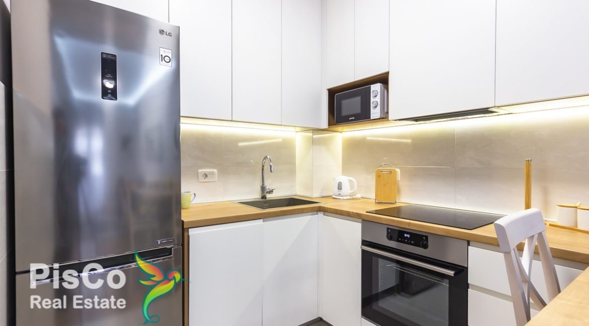 Stan je jednosoban, površine 40m2. Opremljen je veoma lijepim i modernim namještajem. Dnevni boravak posjeduje trosjed i fotelju, TV i klima uređaj, i izlaz na balkon. Kuhinja je odvojena visokim šankom sa stolicama koji je predviđen kao trpezarijski dio. Kuhinja je svijetlih tonova, rađena mo mjeri od kvalitetnih materijala, potpuno opremljena svim neophodnim aparatima. Spavaća soba ima veliki bračni krevet i dva ormana, i takođe izlazi na balkon. Kupatilo je sa velikom tuš kabinom i veš mašinom.