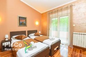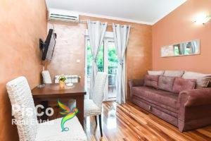 Stan je opremljen lijepim i kvalitetnim namještajem. Sobe su lijepo raspoređene, prostrane i lijepo osvijetljene. Dnevni boravak posjeduje garnituru, TV i klima uređaj, trpezarijski sto sa stolicama, i ima izlaz na balkon. Spavaća soba posjeduje veliki bračni krevet, orman, lijepe dekorativne detalje, i lijepo je osvijetljena. Kuhinja je potpuno opremljena svim neophodnim uređajima. Kupatilo je takože lijepo uređeno. Posjeduje sve neophodne sitnice, tako da je odmah useljiv. Stan ima centralno grijanje, klima uređaj, kabovsku, internet, terasu, veš mašinu. Uračunati su troškovi vode, smeća, interneta i kablovske tv i korišćenja bazana. Plaća se struja po potrošnji.