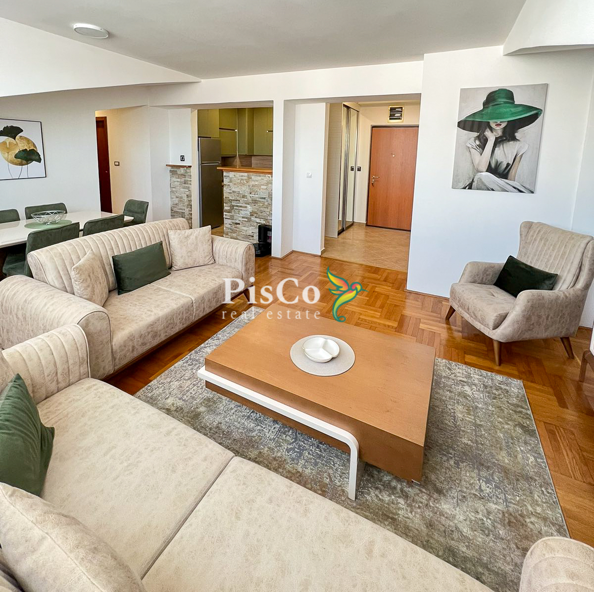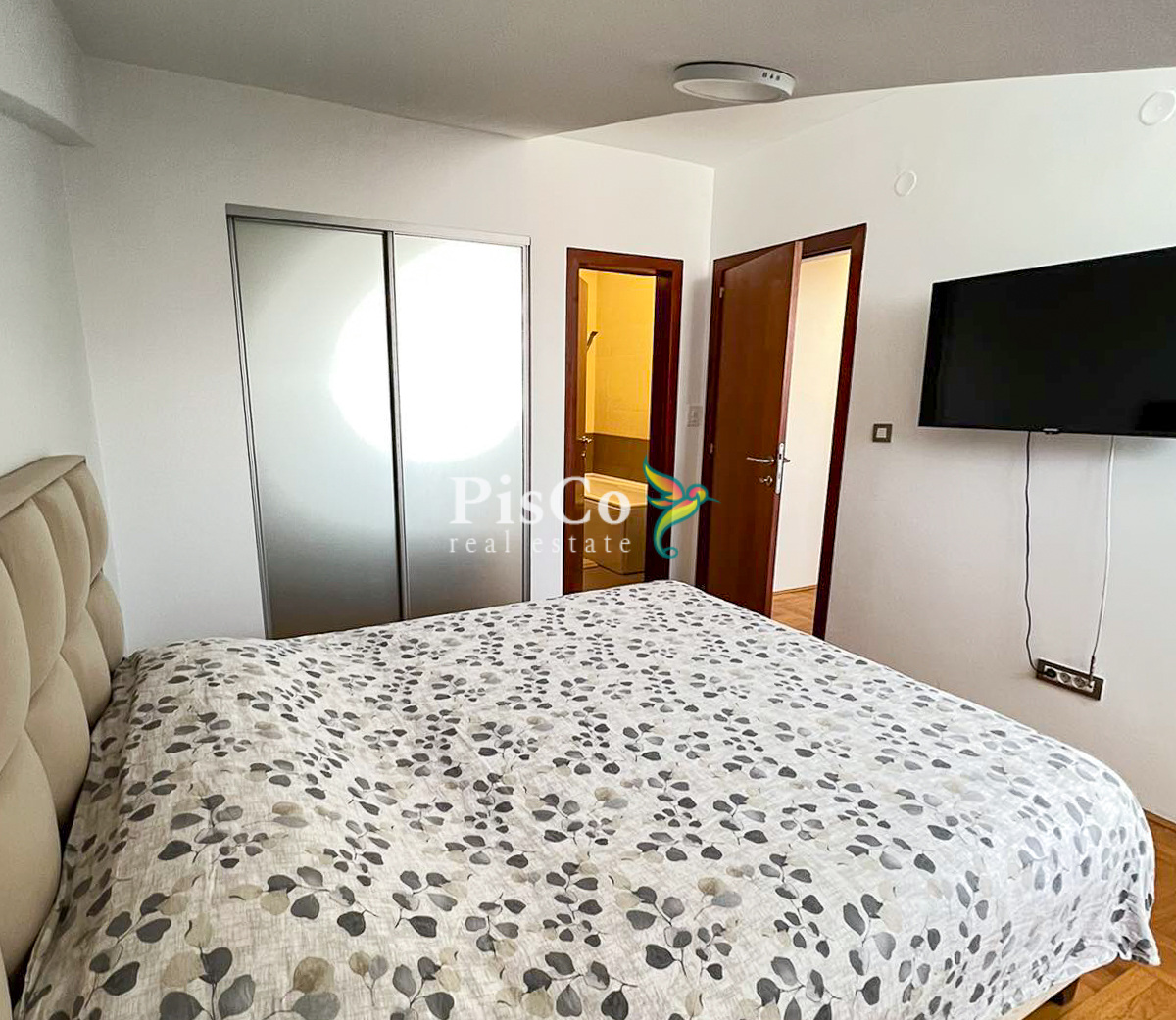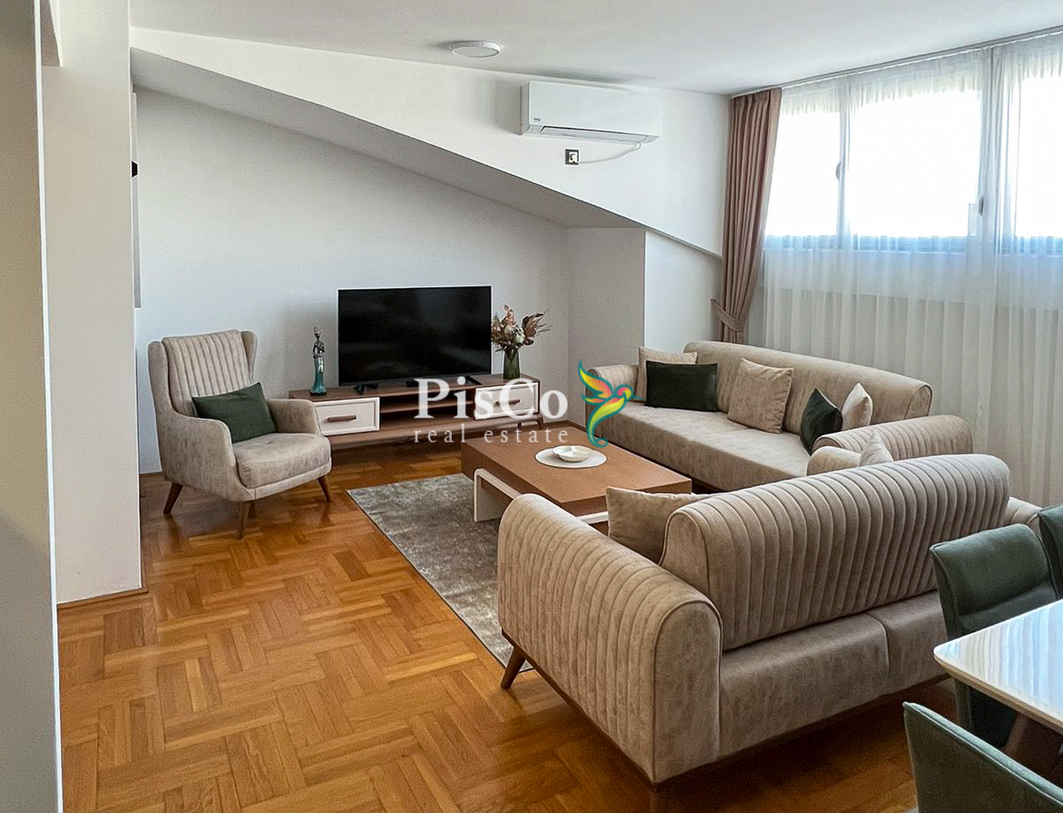 Stan je svijetao, komforan i funkcionalno organizovan. Dnevni boravak je otvoren i povezan sa trpezarijom i kuhinjom, što prostoru daje dodatnu prostranost. Master spavaća soba ima veliki walk-