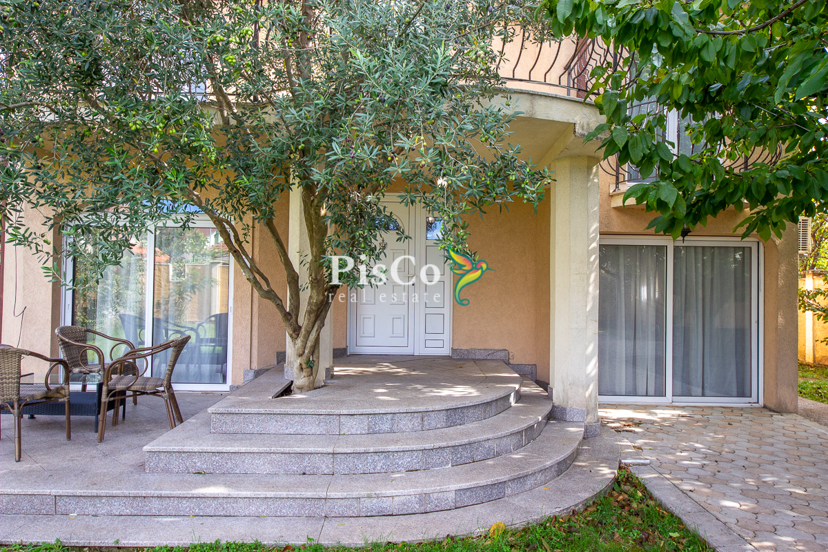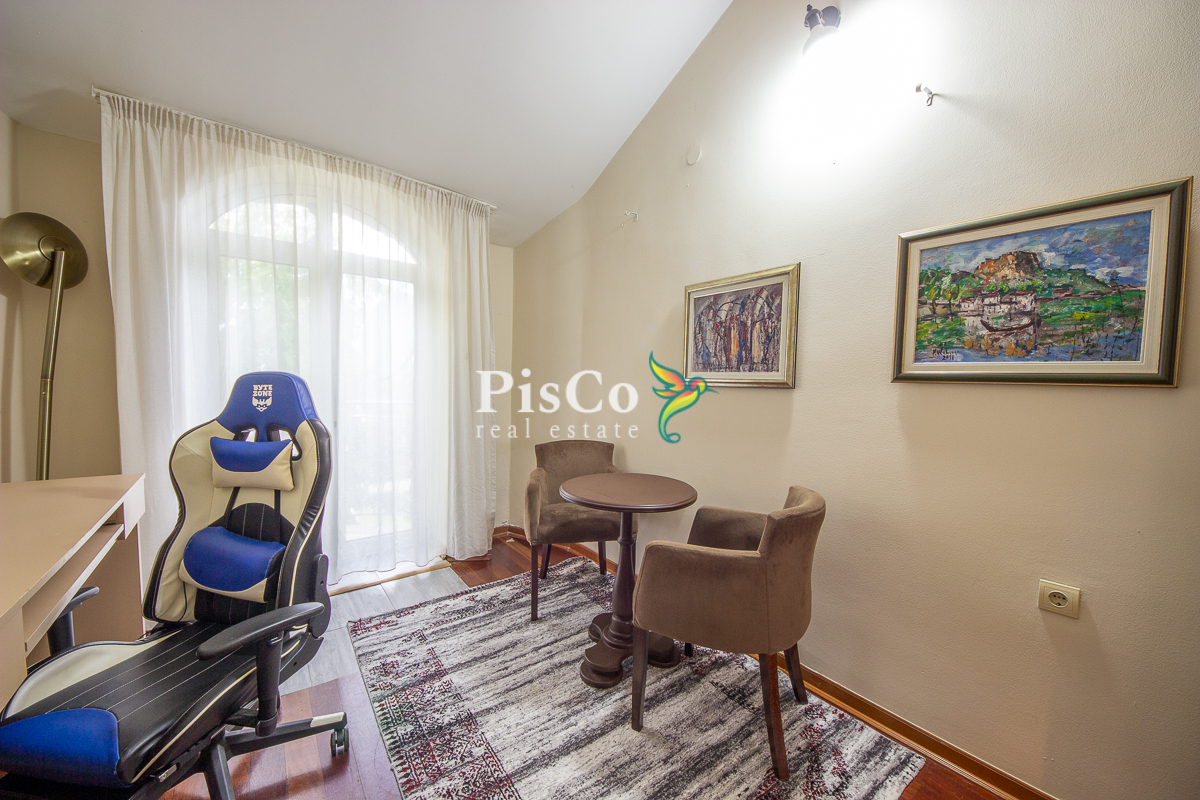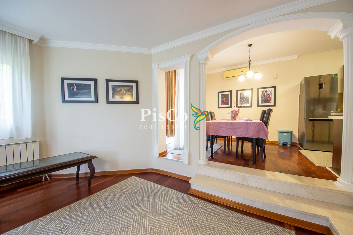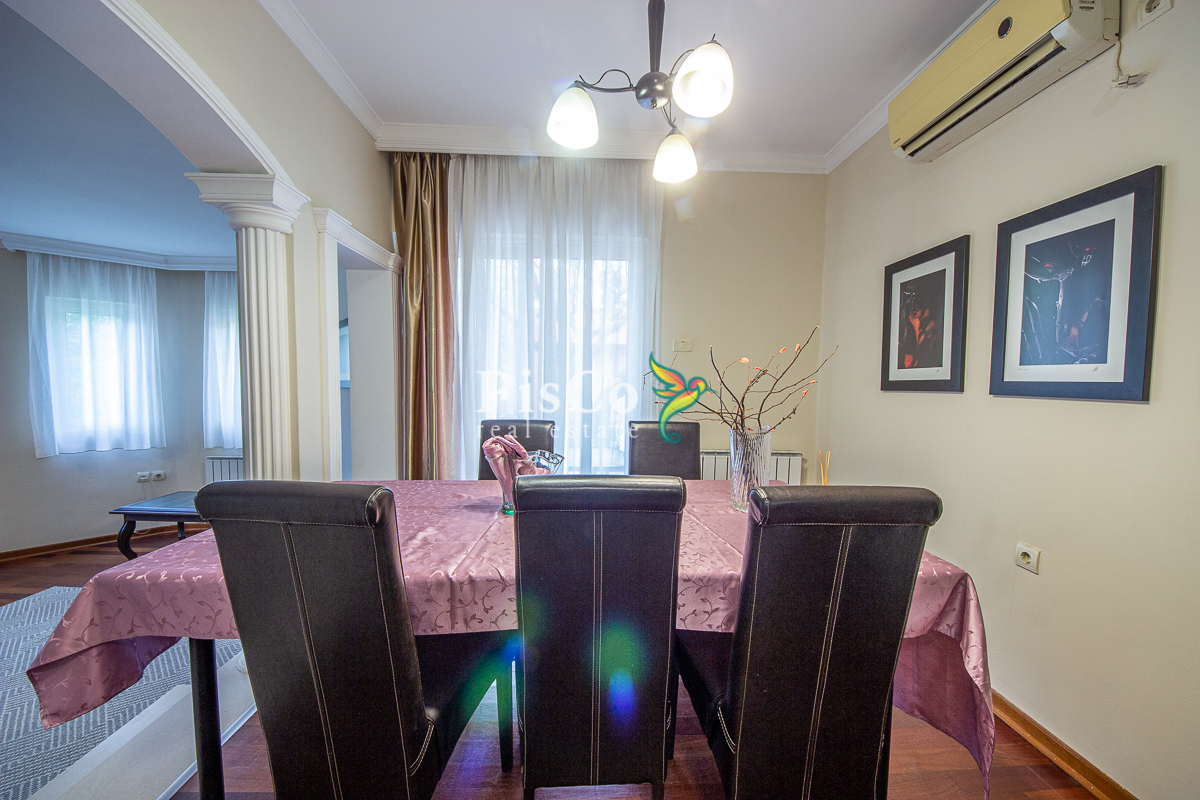 Kuća je prostrana, svijetla i funkcionalno organizovana. U prizemlju se nalazi veliki dnevni boravak povezan sa trpezarijom i potpuno opremljenom kuhinjom u otvorenom konceptu. Prostor odiše toplinom i udobnošću, idealan za svakodnevni život i okupljanja. Na spratu se nalaze četiri komforne spavaće sobe, moderno uređena kupatila od kojih jedno ima đakuzi kadu, kao i velika terasa koja pruža prijatan prostor za opuštanje. Kuća je klimatizovana i opremljena alarmnim sistemom, što dodatno doprinosi komforu i sigurnosti.