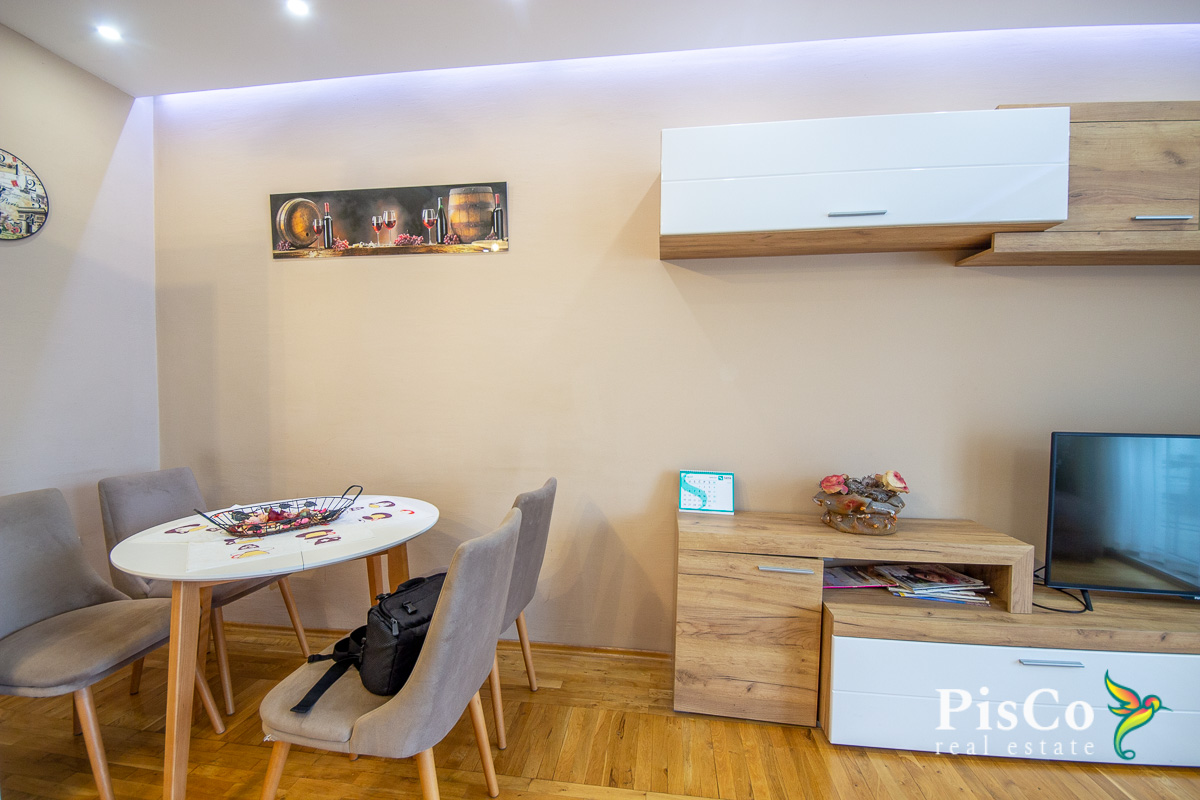 Stan površine 70m² odlikuje moderan dizajn i visokokvalitetan namještaj. Prostrana dnevna soba pruža udobnost i eleganciju, sa LED osvjetljenjem koje doprinosi prijatnoj atmosferi. Kuhinja je potpuno opremljena svim potrebnim kuhinjskim elementima. Kupatilo je moderno uređeno sa kvalitetnom sanitarijom, tuš kabinom i veš mašinom. Stan posjeduje klima uređaj, brzi wifi internet i kablovsku TV, pružajući sve što je potrebno za udoban život. Posjeduje terasu.