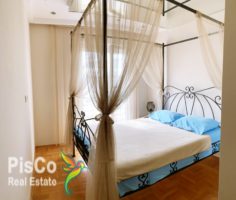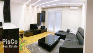 Ovaj jednosoban stan od 47m2 je jako moderno i luksuzno namješten. Dnevna soba upotpunjena je ugaonom garniturom kao i komodom sa TV-om- Odvojena šankom, kuhinja je u potpunosti opremljena svim neophodnim elementima i uređajima. U spavaćoj sobi je lijep bračni krevet sa baldahinom. U kupatilu je hidromasažna kada i velika veš mašina. Stan je klimatizovan i izlazi na jedan balkon.
