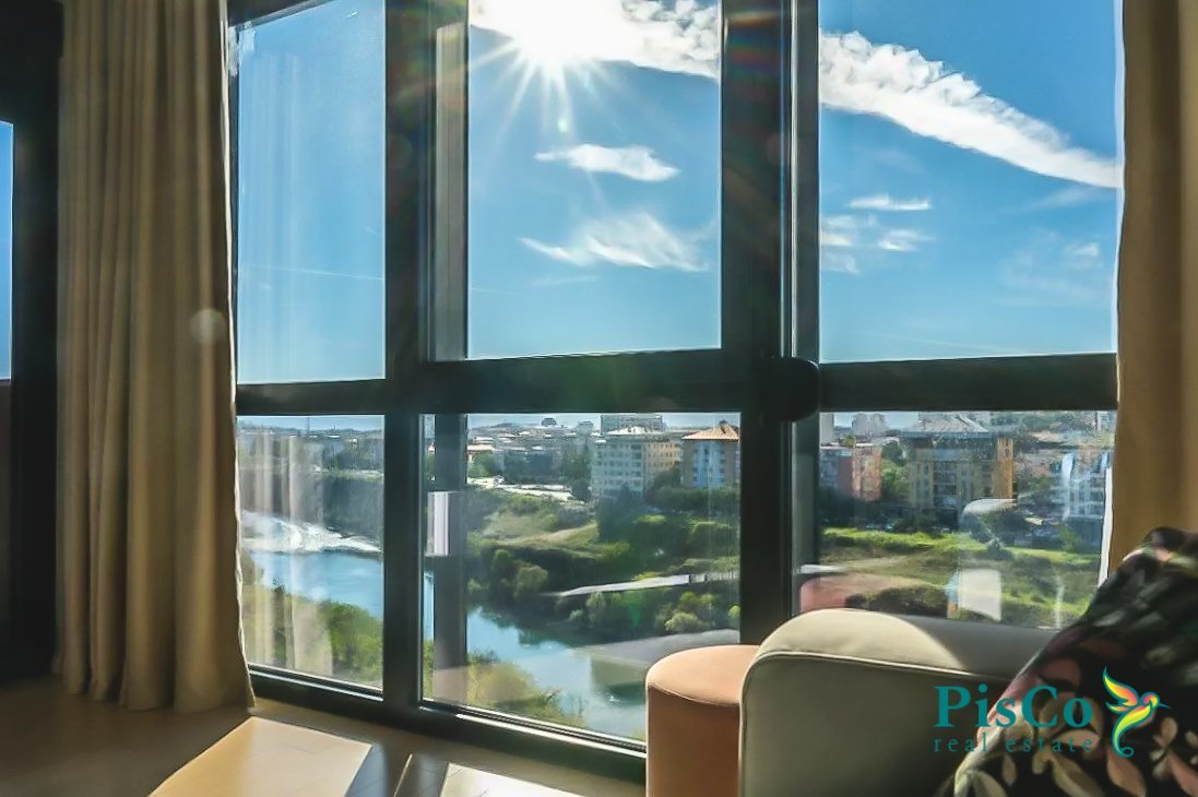 Ovaj divno opremljen stan se nalazi u blizini centra grada u zgradi “Fidija” koja ujedno predstavlja odličnu novogradnju. Zgrada ima moderan lift, a stan ima prelijep pogled na rijeku jer se nalazi na višim spratovima. Okrenut je prema jugo-zapadu.