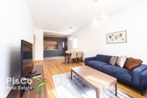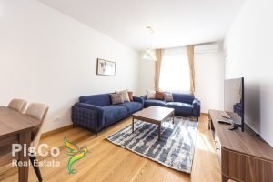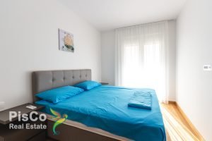 Stan je potpuno opremljen ne samo modernim i lijepim namještajem, već i namještajem koji je kvalitetan. Od ulaznih blind vrata, preko rasvjete i dekorativnih detalja, možemo reći da sve u ovom stanu pruža maksimalan komfor i ugođaj za sve koji vole ovakav stil življenja. Dnevni boravak je prostran, sa lijepom garniturom, TV i klima uređajem, i izlazi na balkon. U sklopu je trpezarijski sto sa stolicama, a u nastavku kuhinja. Kuhinja je funkcionalna i opremljena svim neophodnim uređajima, i daje posebnu notu cijelokupnom ambijentu. Jedna spavaća soba ima veliki bračni krevet i orman dok su u drugoj dva singl kreveta i takođe ima izlaz na balkon. Kupatilo je lijepo uređeno, sa finim sanitarijama, tuš kabinom i veš mašinom.