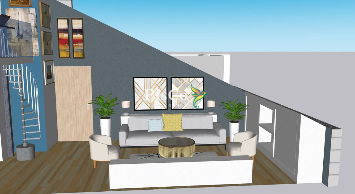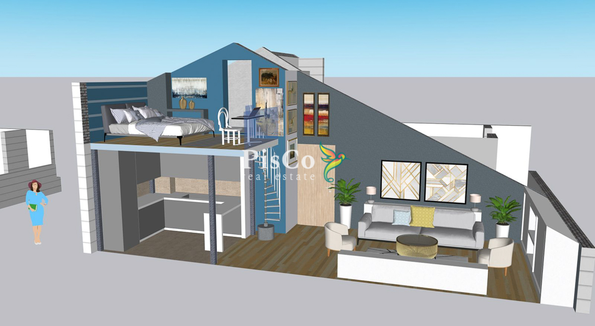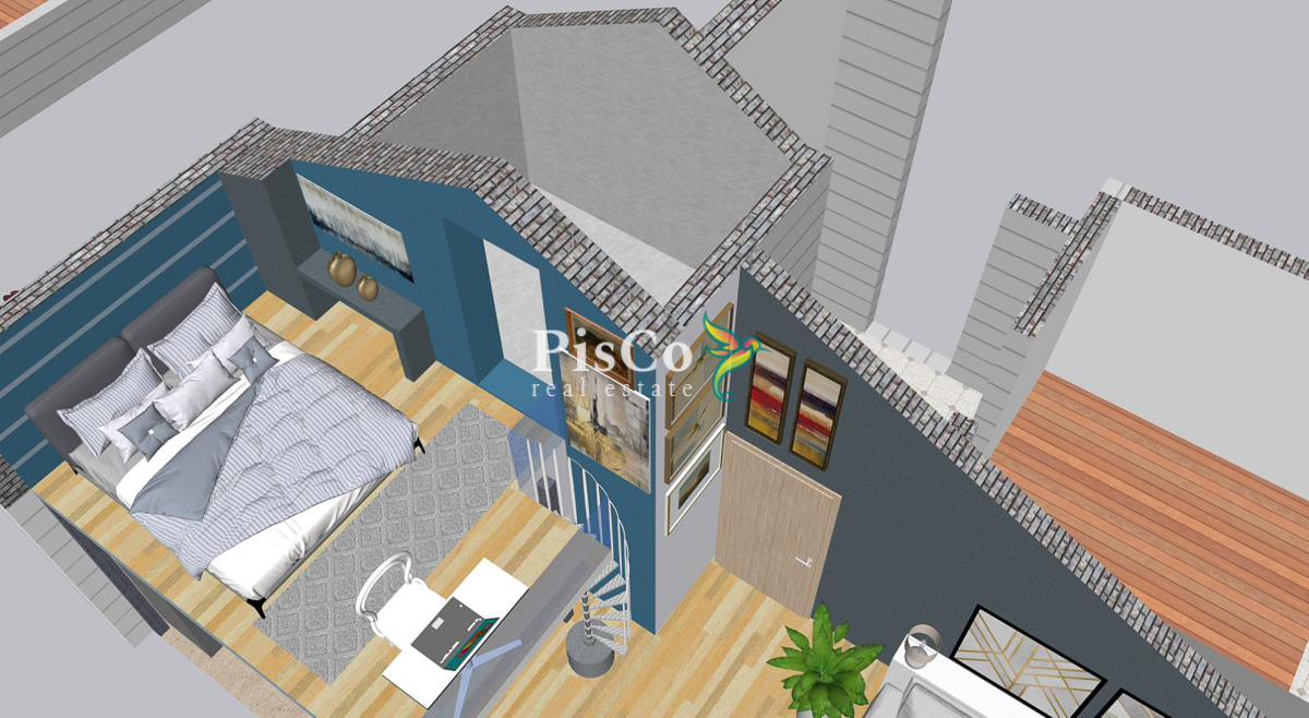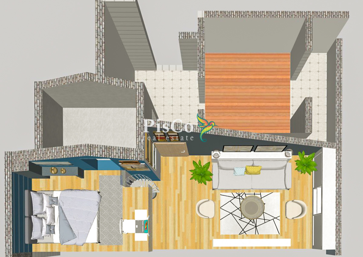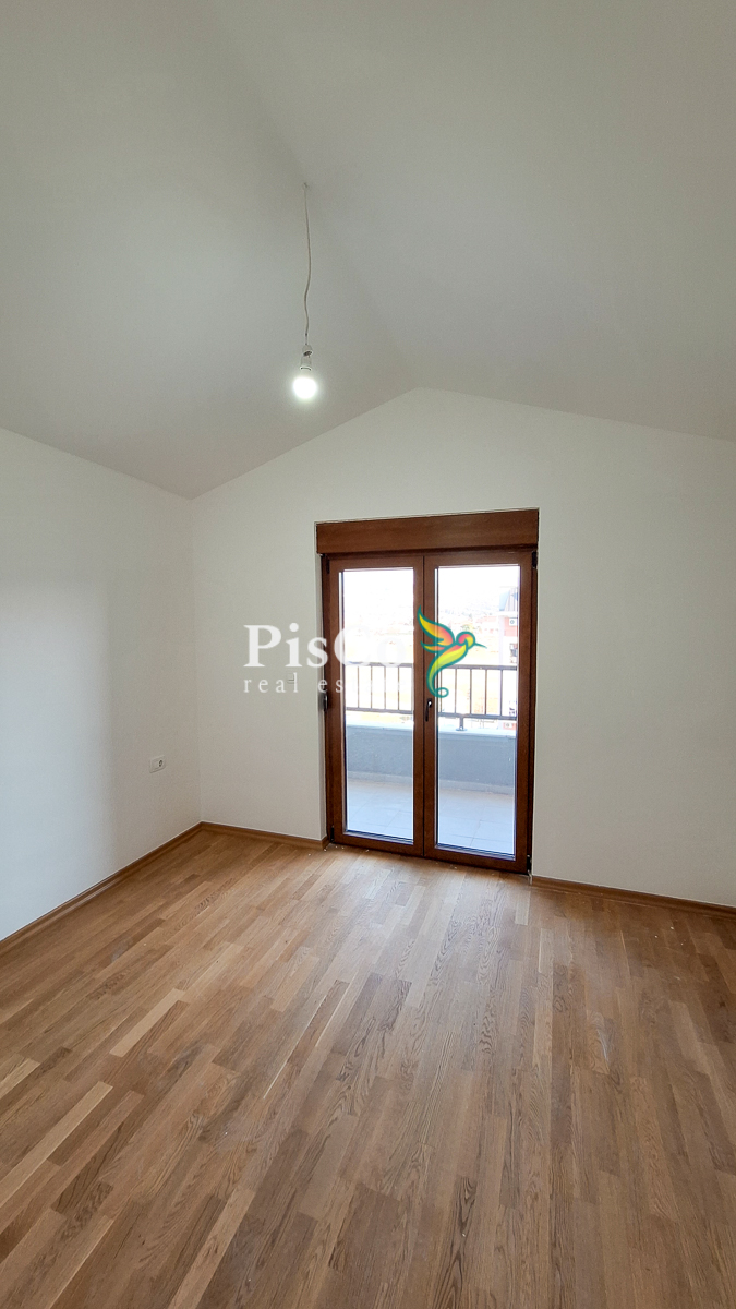 Stan je funkcionalnog rasporeda i obuhvata dnevni boravak sa trpezarijom, odvojenu kuhinju, spavaću sobu, kupatilo i terasu. Postoji gotov projekat za nadogradnju i formiranje dodatne sobe, čime se stan može pretvoriti u duplex. Zahvaljujući položaju na poslednjem spratu, stan ima dobru osvijetljenost i mirniji ambijent bez buke iznad.