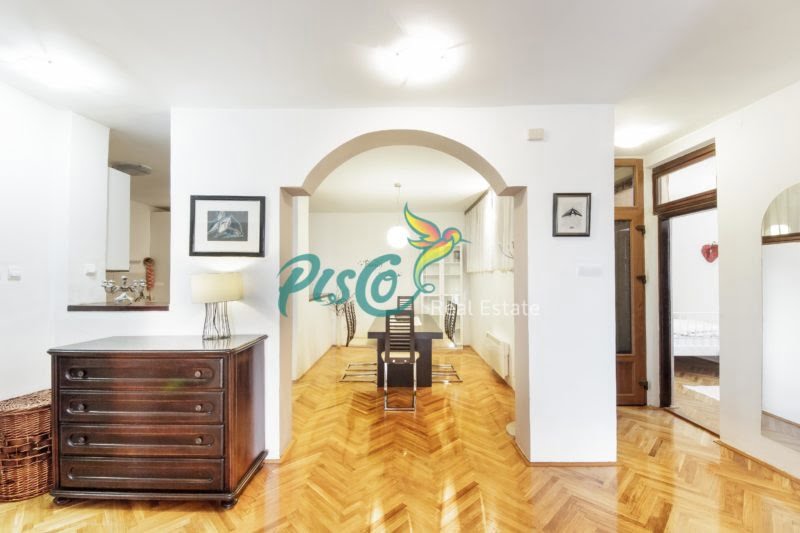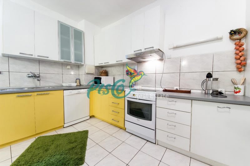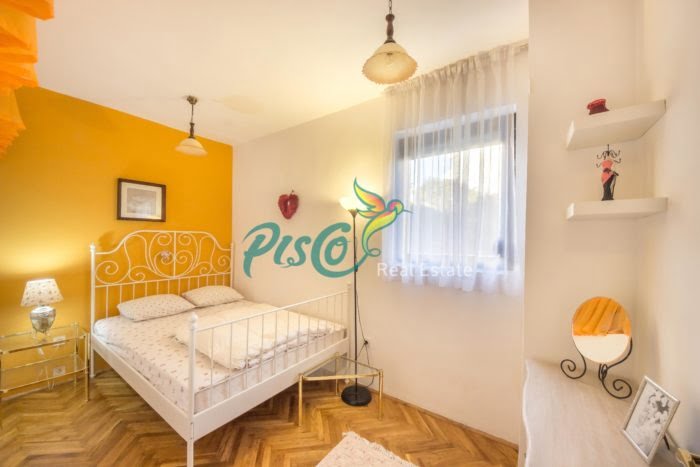Apartman se prostire na 120m2. Prostorije su lijepo povezane i prostor je dobro iskorišten i funkcionalan. Apartman ima tri spavaće sobe, veliki dnevni boravak sa izlazom u vrt, prostranu kuhinju i odvojenu trpezariju. Idealan je za veću porodicu ili za klijente koji žele komfor. Kuhinja posjeduje sve uredjaje i pruža sve uslove za rad. Sobe su opremljene plakarima, posteljinom i veoma prijatne. Takodje tu su i dvije sanitarne prostorije, kupatilo i toalet za goste. Zvučna i toplotna izolacija je odlična i pruža osjećaj pune intime. Podovi su uradjeni od kvalitetnog drvenog parketa. Sredstva komunikacije, internet, tv, telefon su takodje na raspolaganju.